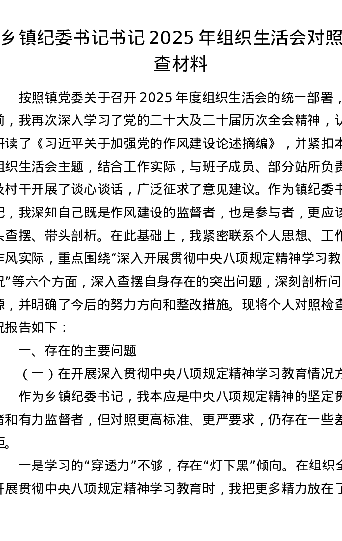 乡镇纪委书记书记2025年组织xxx对照检查材料
