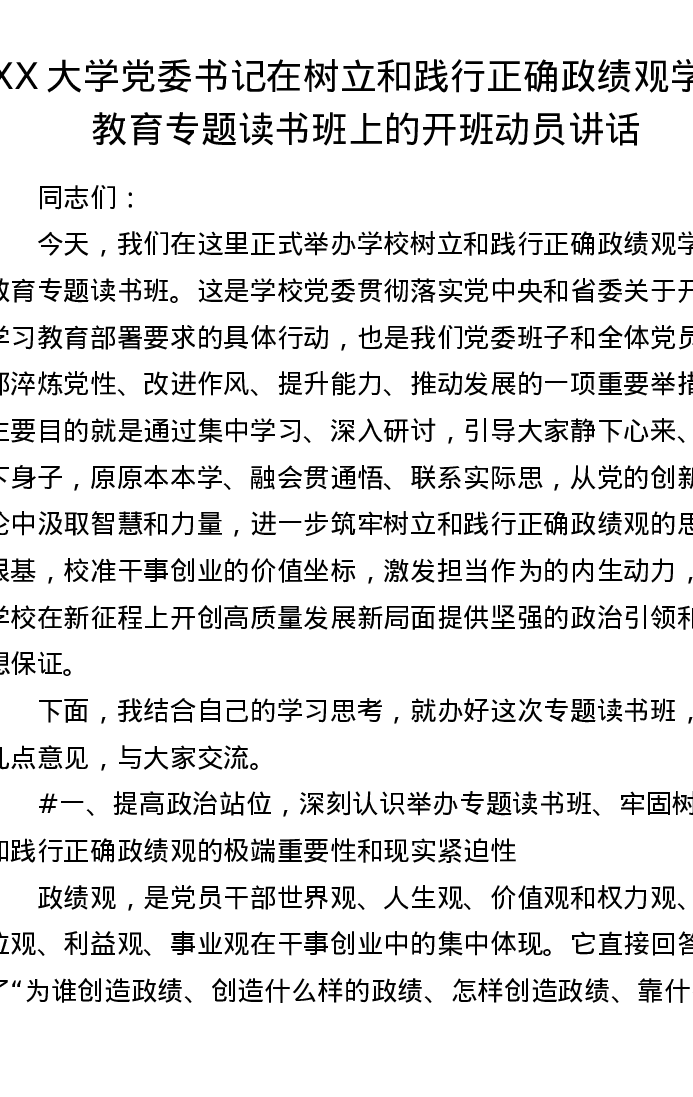 XX大学党委书记在树立和践行正确ZJG学习教育专题读书班上的开班动员讲话(7410字)