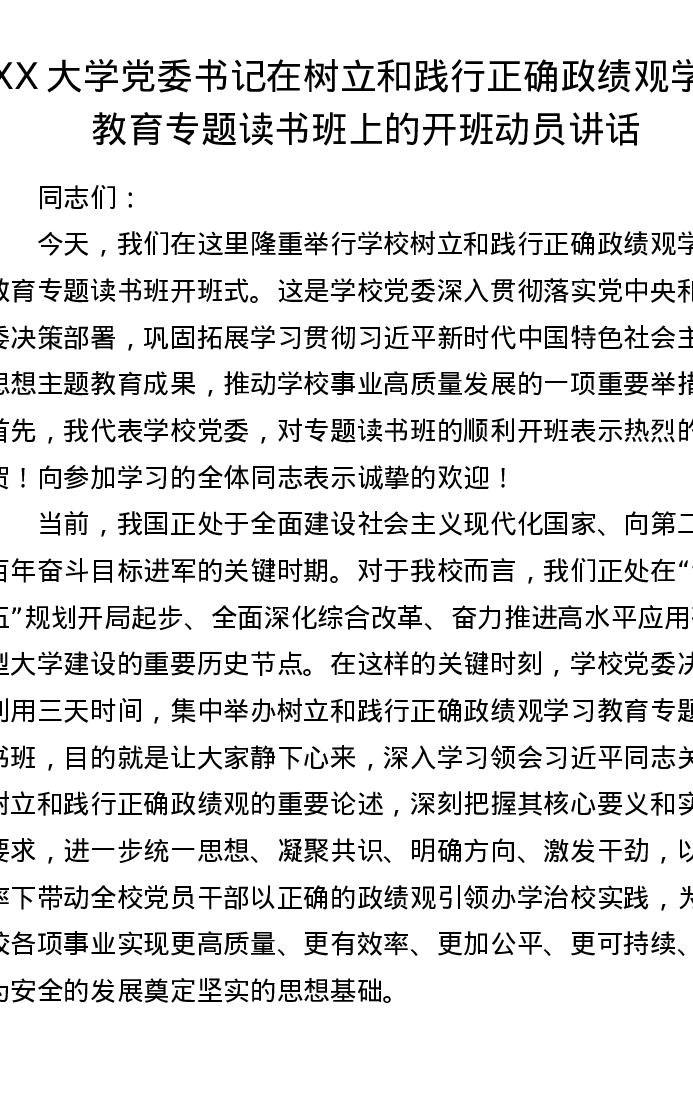 XX大学党委书记在树立和践行正确ZJG学习教育专题读书班上的开班动员讲话