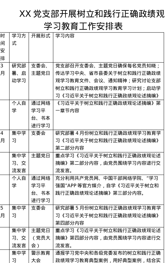 XX党支部开展树立和践行正确ZJG学习教育工作安排表(表格