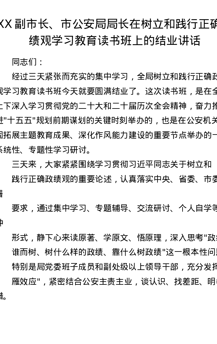 XX副市长、市公安局局长在树立和践行正确ZJG学习教育读书班上的结业讲话(5167字)