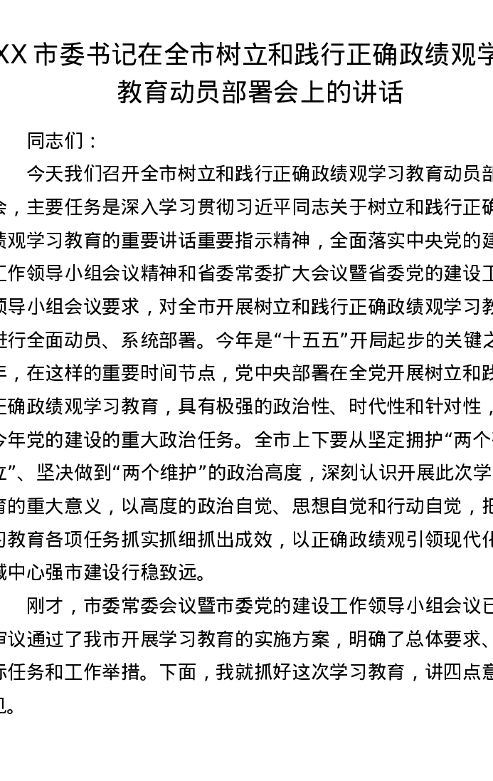 XX市委书记在全市树立和践行正确ZJG学习教育动员部署会上的讲话2