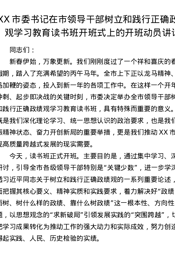 XX市委书记在市领导干部树立和践行正确ZJG学习教育读书班开班式上的开班动员讲话2