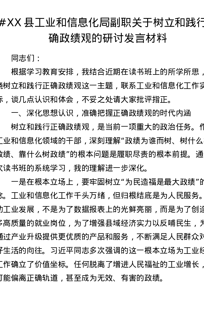 XX县工业和信息化局副职关于树立和践行正确ZJG的研讨发言材料