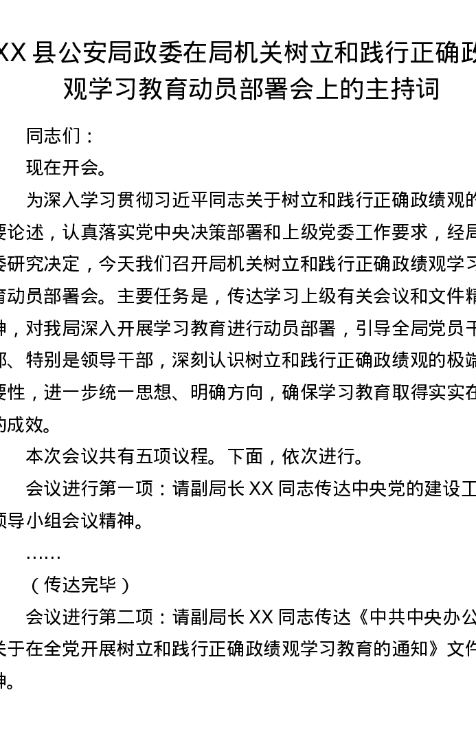 XX县公安局政委在局机关树立和践行正确ZJG学习教育动员部署会上的主持词2