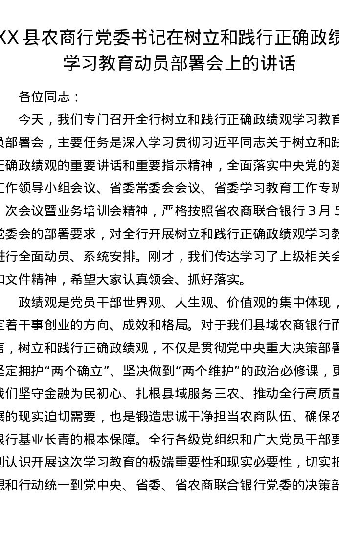 XX县农商行党委书记在树立和践行正确ZJG学习教育动员部署会上的讲话