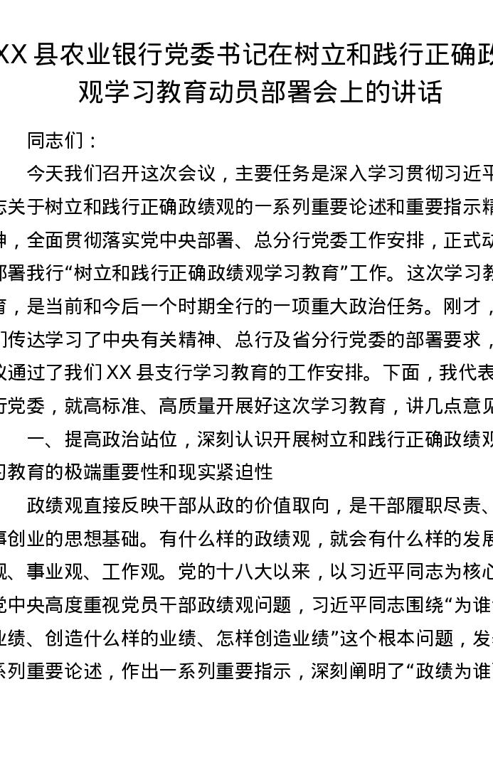 XX县农业银行党委书记在树立和践行正确ZJG学习教育动员部署会上的讲话