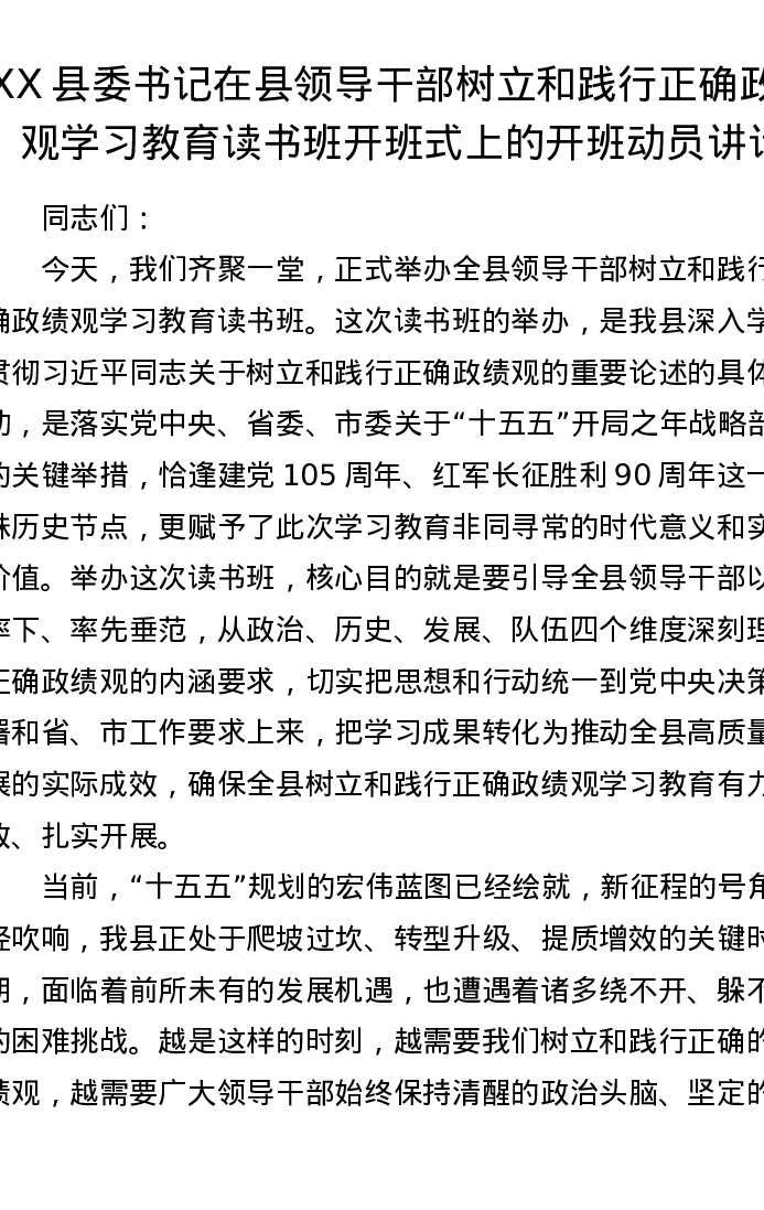 XX县委书记在县领导干部树立和践行正确ZJG学习教育读书班开班式上的开班动员讲话2