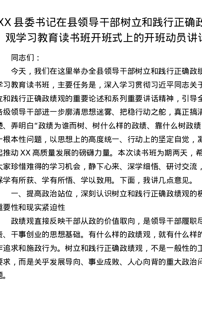 XX县委书记在县领导干部树立和践行正确ZJG学习教育读书班开班式上的开班动员讲话3