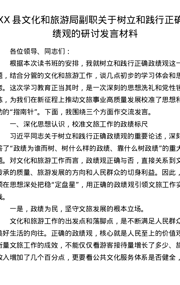 XX县文化和旅游局副职关于树立和践行正确ZJG的研讨发言材料