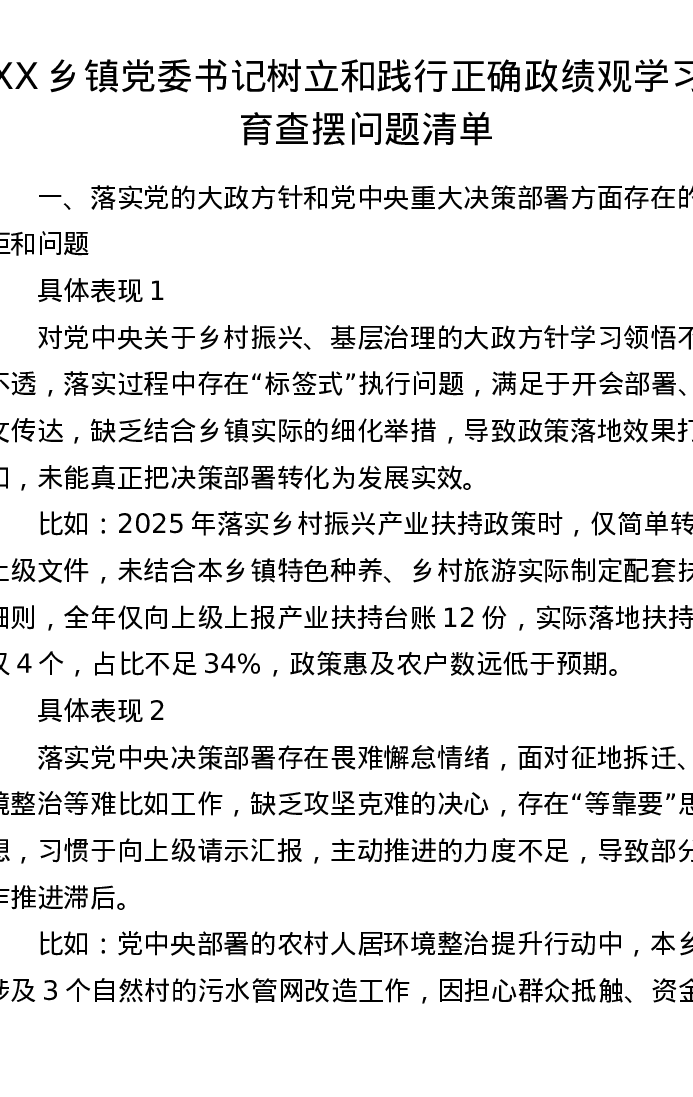 XX乡镇党委书记树立和践行正确ZJG学习教育查摆问题清单2