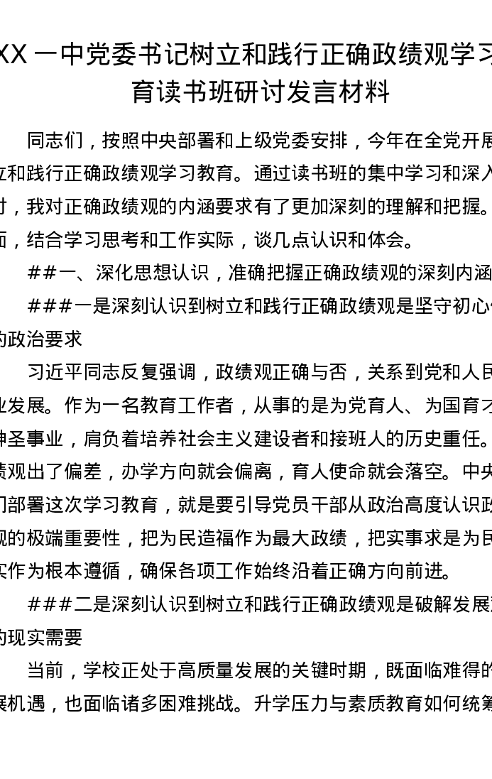 XX一中党委书记树立和践行正确ZJG学习教育读书班研讨发言材料