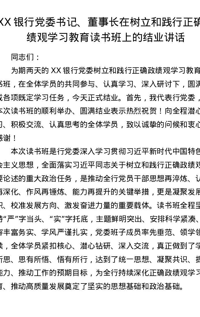 XX银行党委书记、董事长在树立和践行正确ZJG学习教育读书班上的结业讲话2