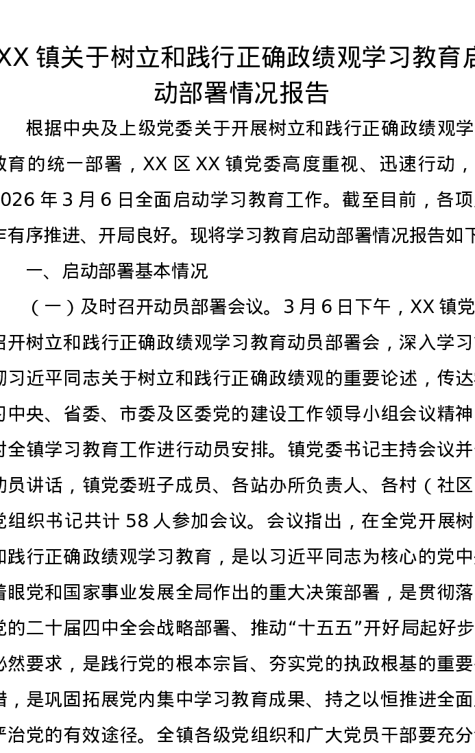 XX镇关于树立和践行正确ZJG学习教育启动部署情况报告
