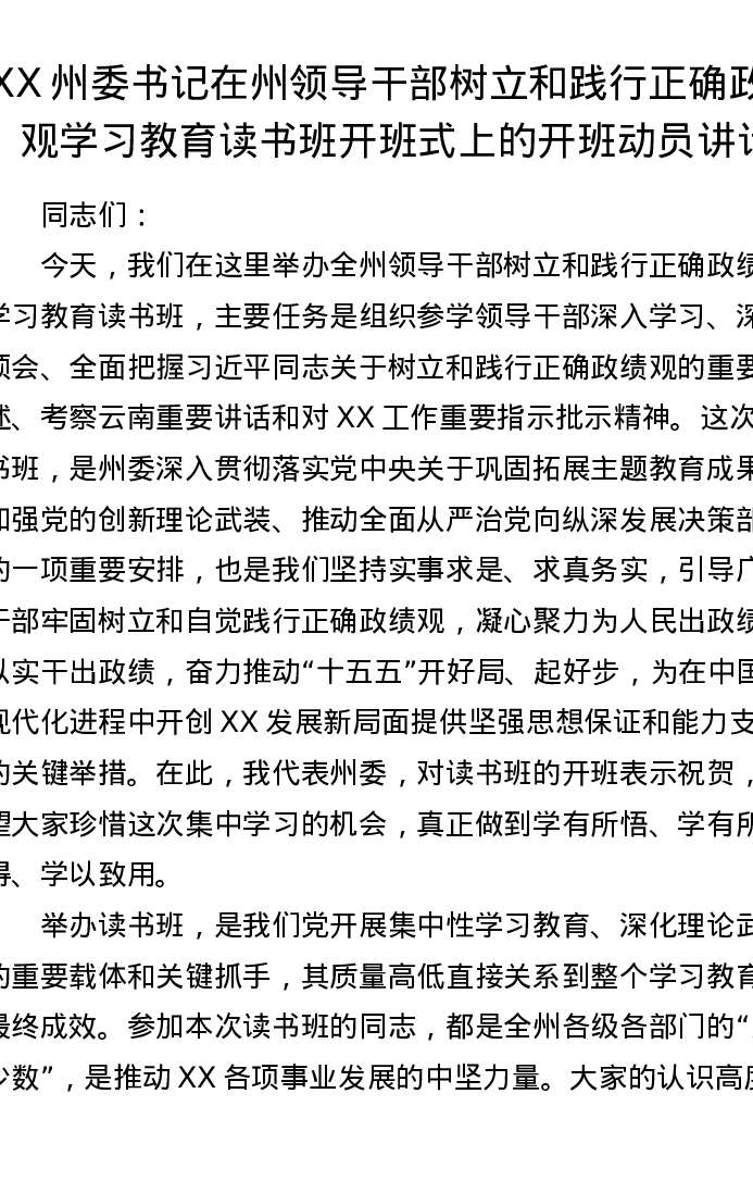XX州委书记在州领导干部树立和践行正确ZJG学习教育读书班开班式上的开班动员讲话