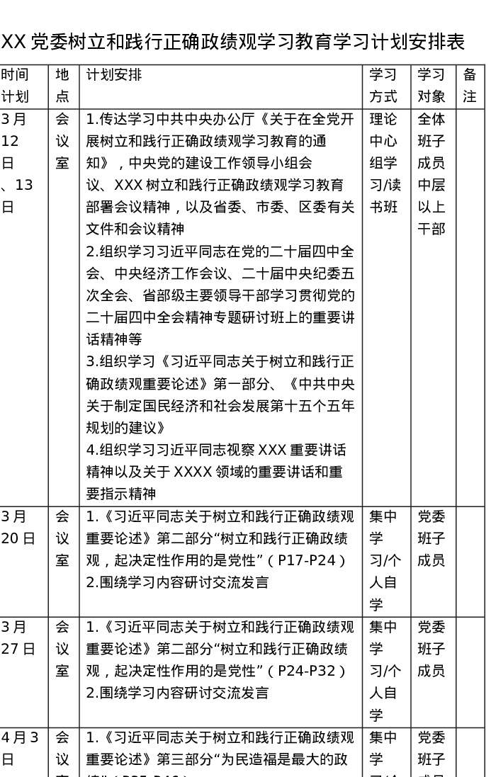 党委树立和践行正确ZJG学习教育学习计划安排表(表格)