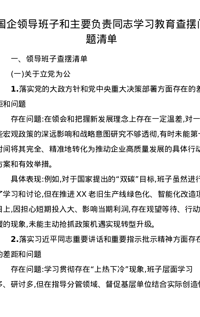 国企领导班子和主要负责同志ZJG学习教育查摆问题清单