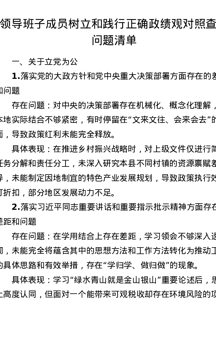 领导班子成员树立和践行正确ZJG对照查摆问题清单
