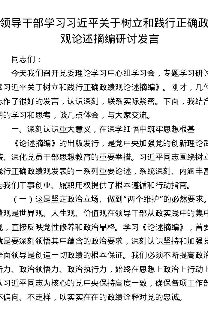领导干部学习总书记关于树立和践行正确ZJG论述摘编研讨发言