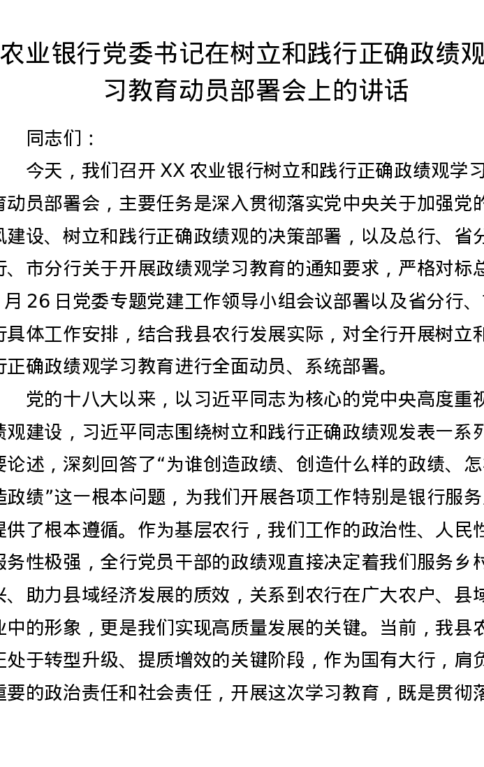 农业银行党委书记在树立和践行正确ZJG学习教育动员部署会上的讲话