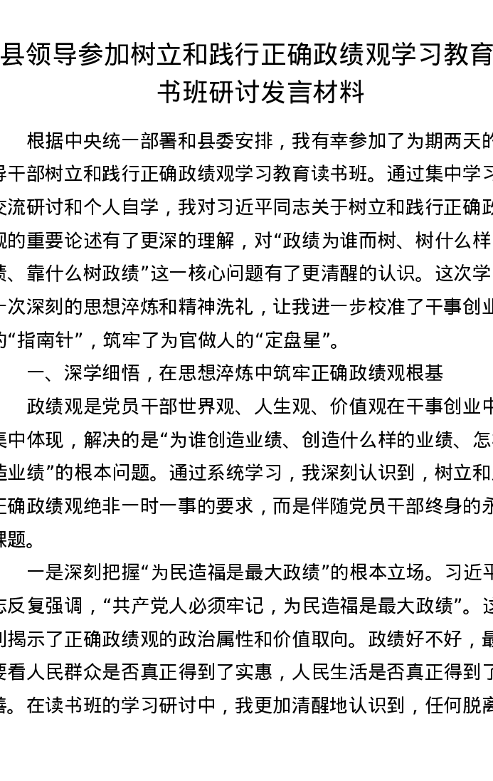 县领导参加树立和践行正确ZJG学习教育读书班研讨发言材料