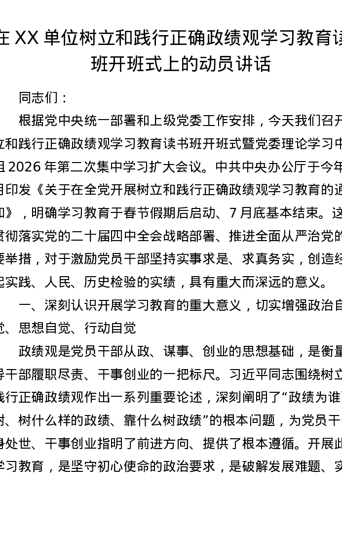 在XX单位树立和践行正确ZJG学习教育读书班开班式上的动员讲话