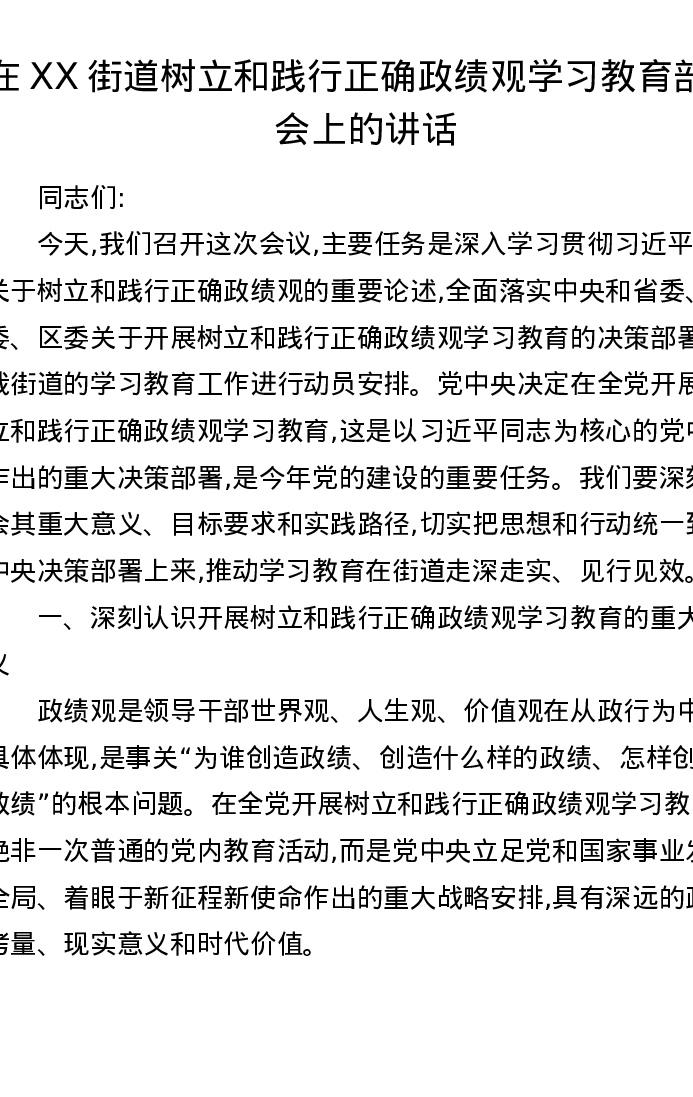 在XX街道树立和践行正确ZJG学习教育部署会上的讲话