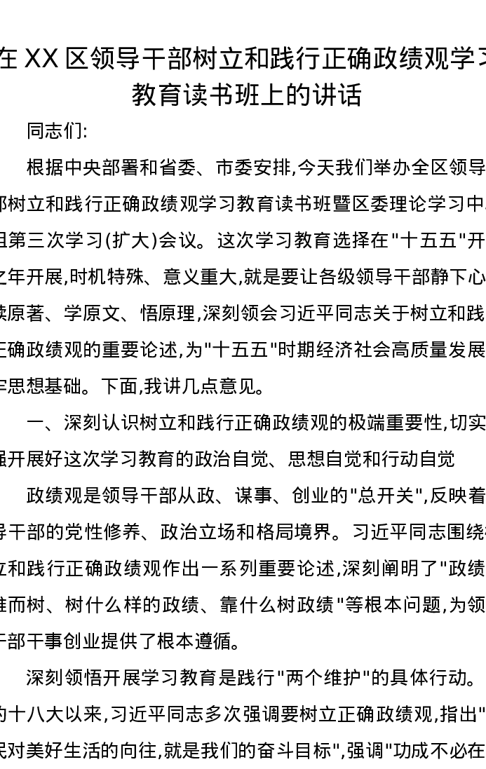 在XX区领导干部树立和践行正确ZJG学习教育读书班上的讲话