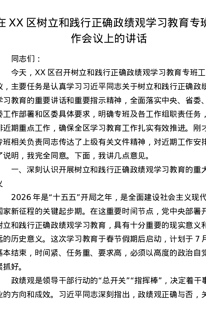 在XX区树立和践行正确ZJG学习教育专班工作会议上的讲话