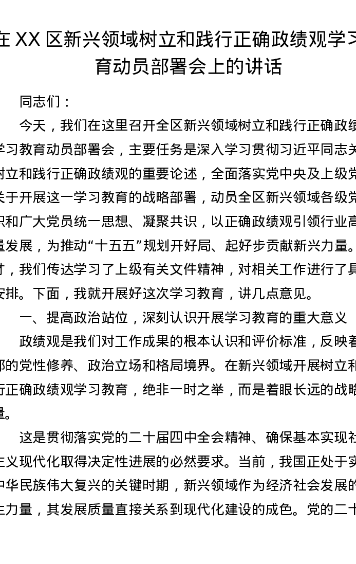 在XX区新兴领域树立和践行正确ZJG学习教育动员部署会上的讲话