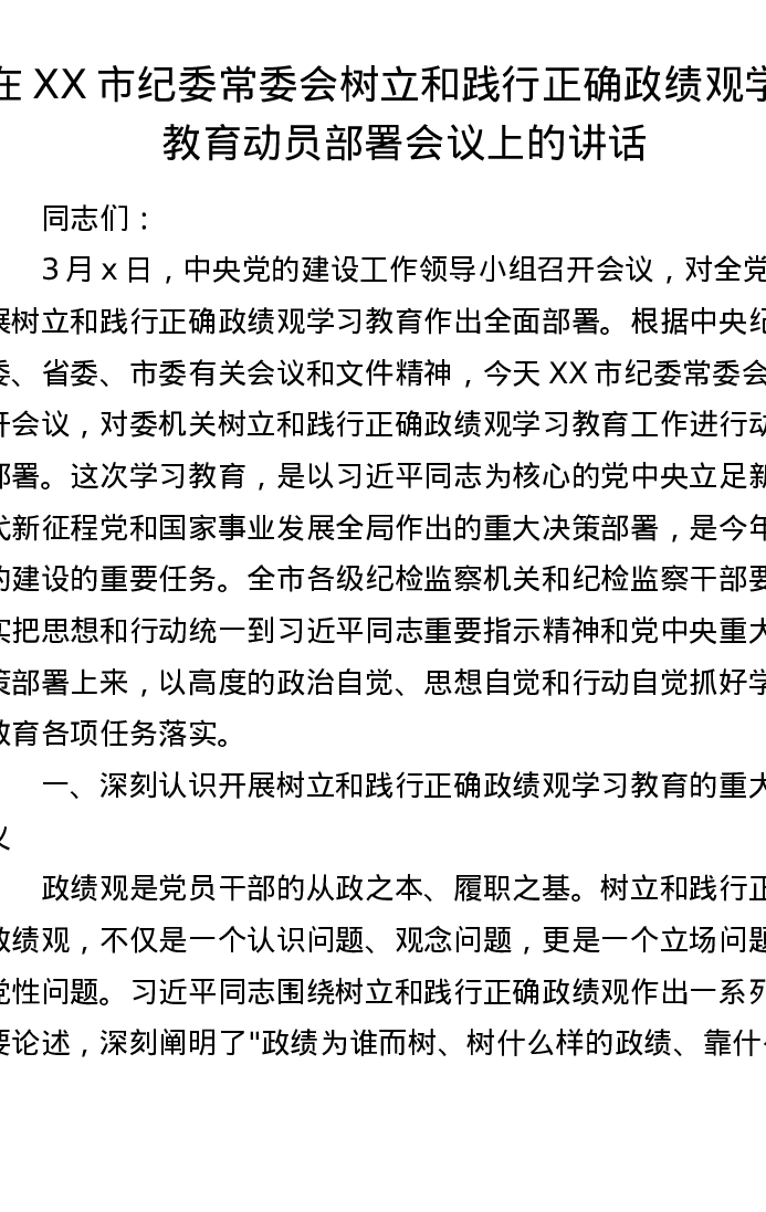 在XX市纪委常委会树立和践行正确ZJG学习教育动员部署会议上的讲话