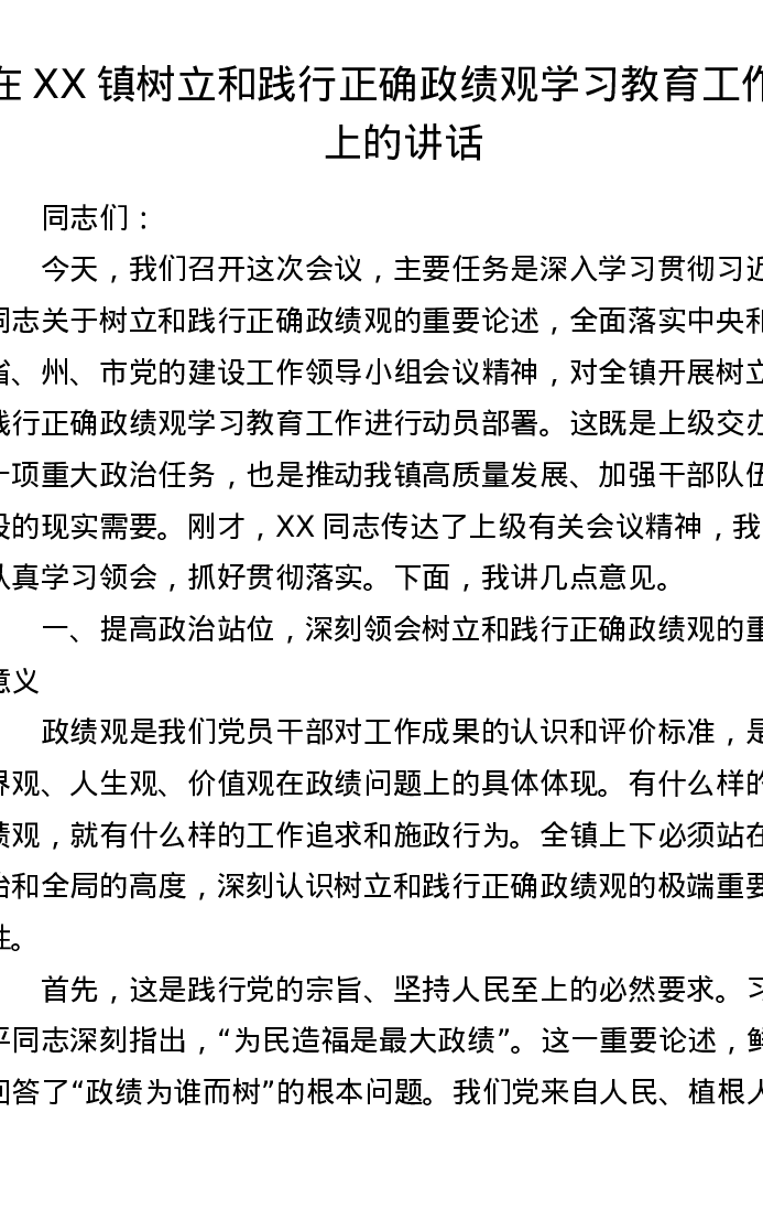 在XX镇树立和践行正确ZJG学习教育工作会上的讲话