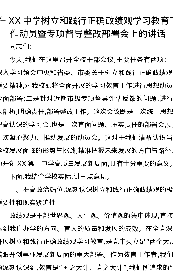在XX中学树立和践行正确ZJG学习教育工作动员暨专项督导整改部署会上的讲话