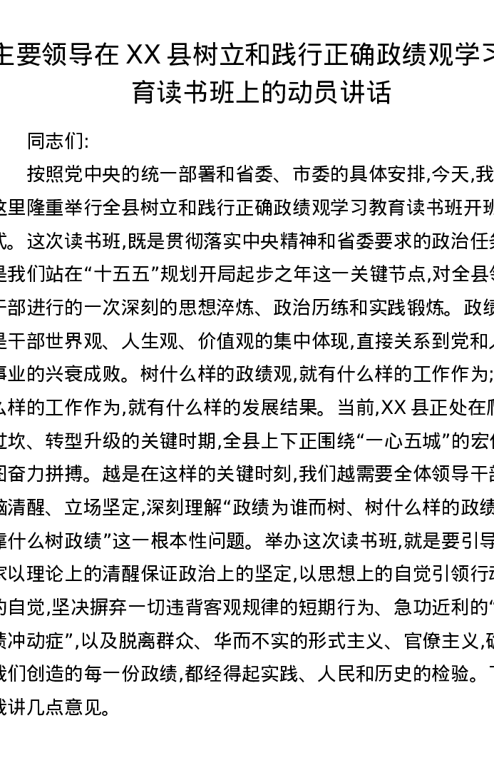 主要领导在XX县树立和践行正确ZJG学习教育读书班上的动员讲话