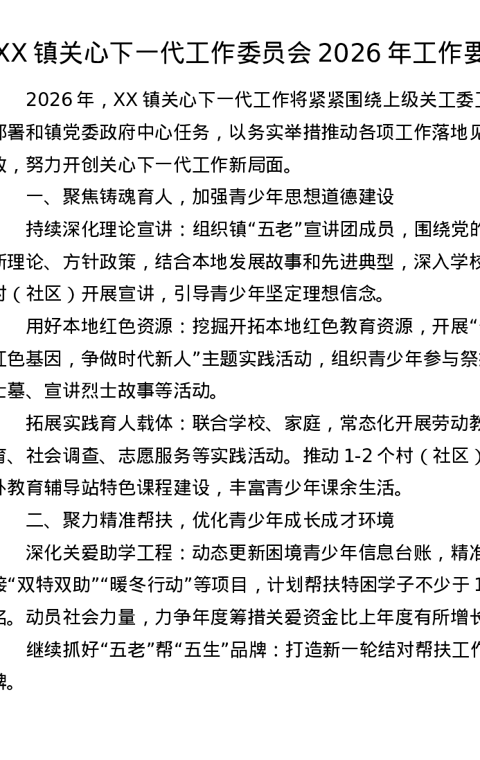XX 镇关心下一代工作委员会 2026 年工作要点