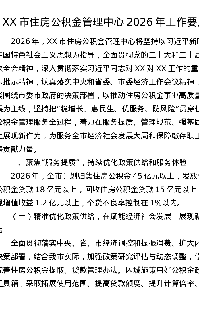 XX市住房公积金管理中心2026年工作要点