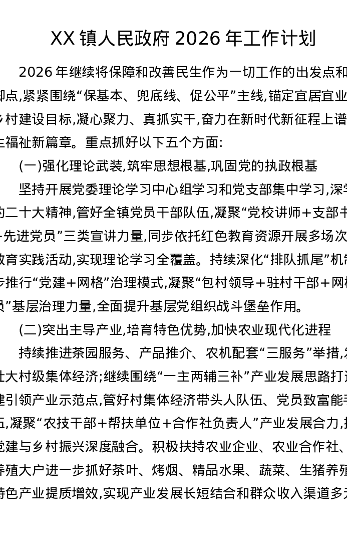 XX镇人民政府2026年工作计划