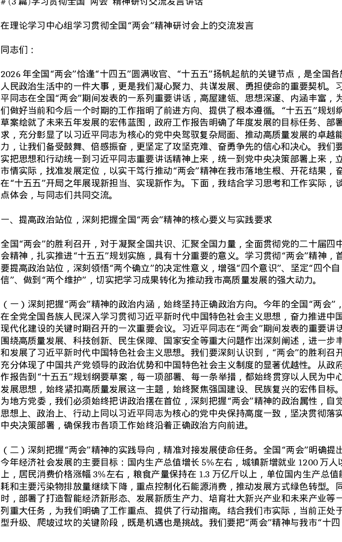 汇编:学习贯彻全国两会精神研讨交流发言讲话3篇