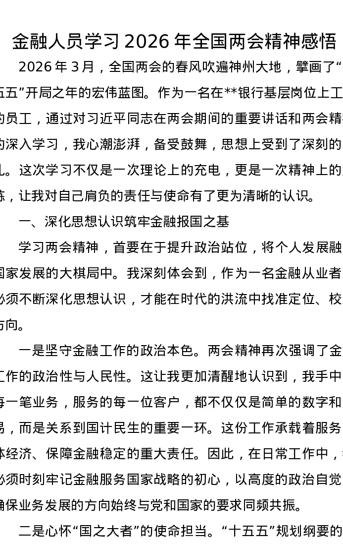 金融人员学习2026年全国两会精神感悟心得
