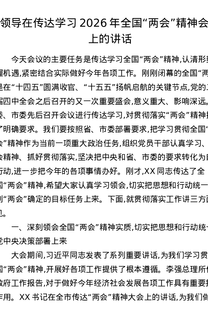 领导在传达学习2026年全国两会精神会议上的讲话