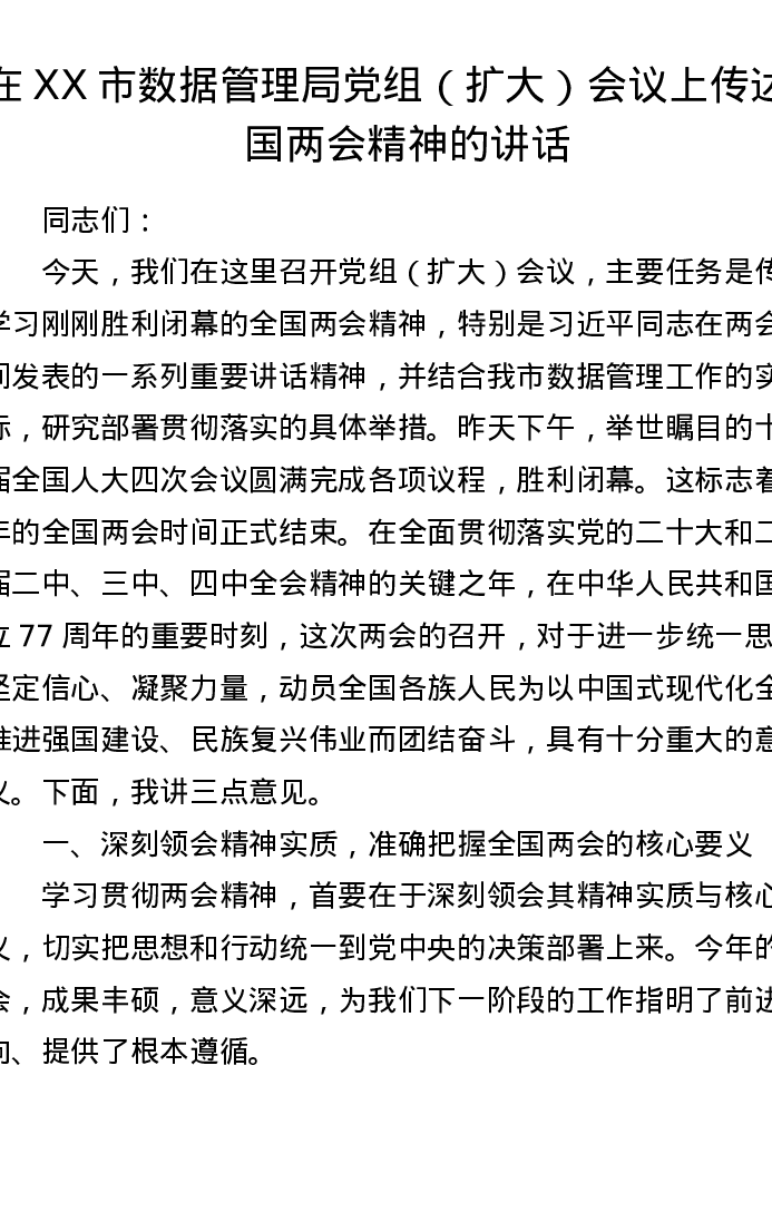 在XX市数据管理局党组(扩大)会议上传达全国两会精神的讲话