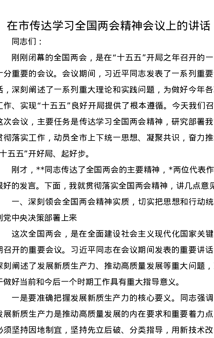 在市传达学习全国两会精神会议上的讲话