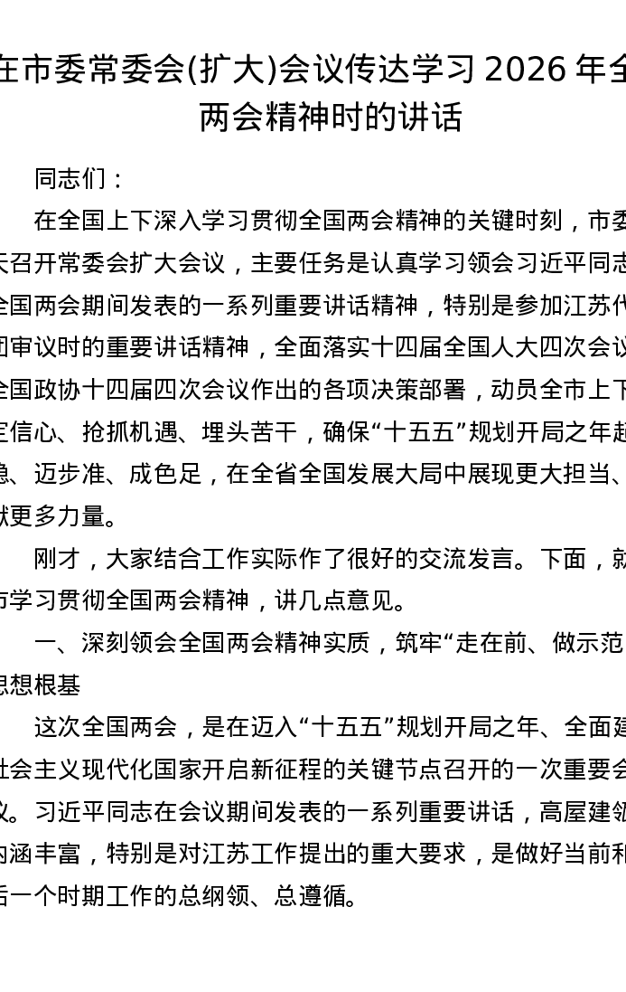在市委常委会(扩大)会议传达学习2026年全国两会精神时的讲话
