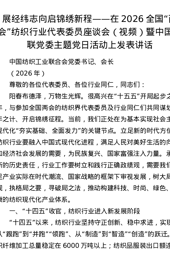 展经纬志向 启锦绣新程——在2026全国两会纺织行业代表委员座谈会(视频)暨中国纺联党委主题党日活动上发表讲话
