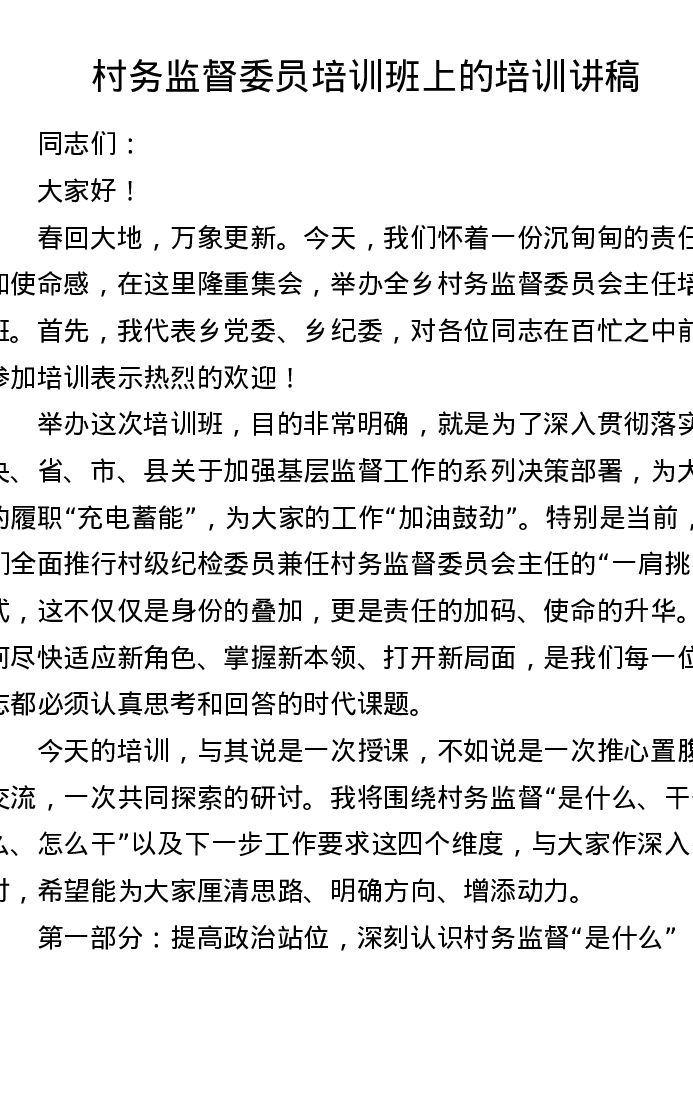 村务监督委员培训班上的培训讲稿