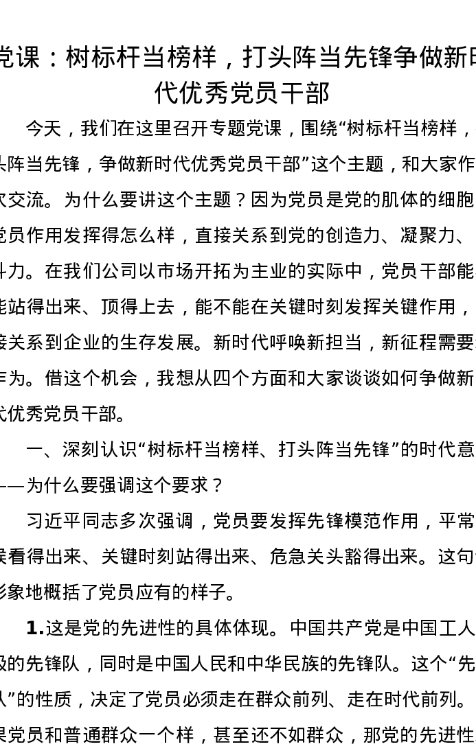 党课:树标杆当榜样,打头阵当先锋 争做新时代优秀党员干部