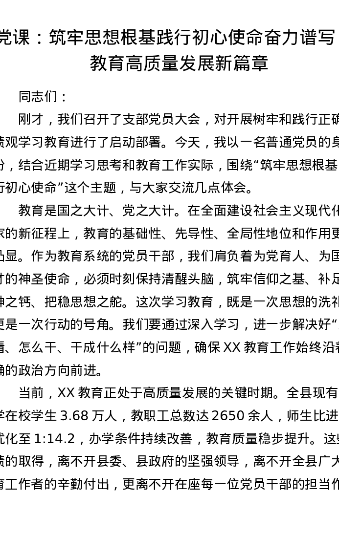 党课:筑牢思想根基 践行初心使命 奋力谱写 XX 教育高质量发展新篇章
