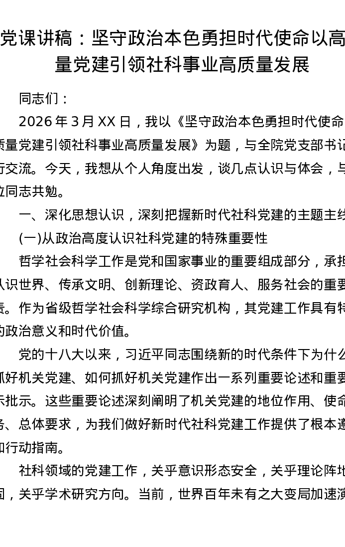 党课讲稿:坚守政治本色 勇担时代使命 以高质量党建引领社科事业高质量发展