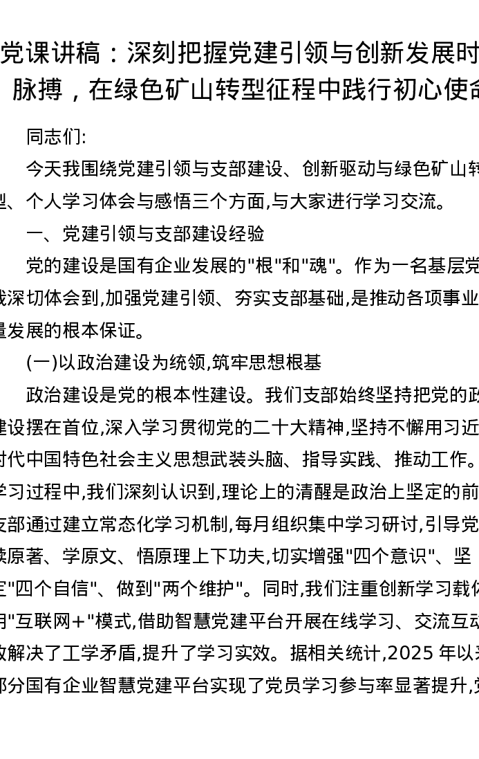 党课讲稿:深刻把握党建引领与创新发展时代脉搏,在绿色矿山转型征程中践行初心使命