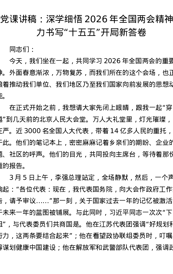 党课讲稿:深学细悟2026年全国两会精神 奋力书写十五五开局新答卷
